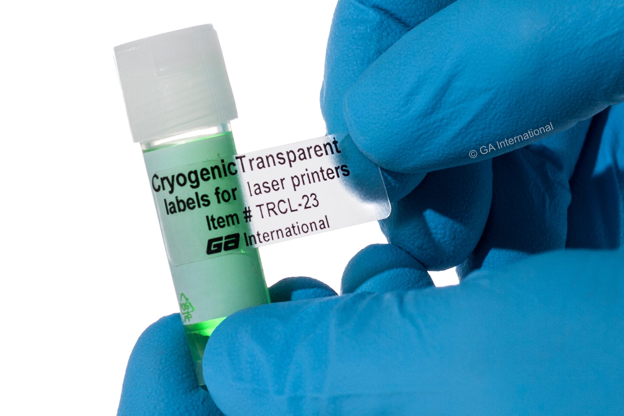 Transparent, removable laser labels are for short and long-term storage of polycarbonate, polypropylene, and cardboard cryo and freezer boxes in harsh deep-freeze or cryogenic environments, including liquid phase liquid nitrogen, laboratory freezers, and dry ice transport, all of which are used in biomedical research and clinical laboratories. With a glove-friendly adhesive, these transparent cryogenic labels can be can be applied to flat glass, plastic, and metal surfaces, and removed without leaving any label or adhesive residue on the surface